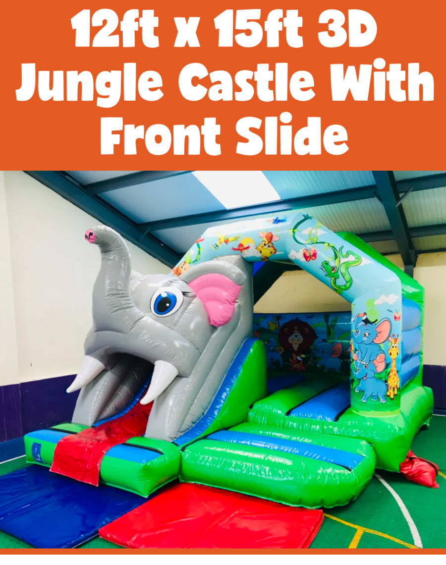 Back to Bouncy Castle With Slide 15x12 jungle castle with slide 3D DetailsSizeSuitability Immerse Yourself in a Jungle Adventure with Our 15x12 Jungle Castle with Slide 3D 🌴🐘 Bring the excitement of the wild to your next event with our spectacular 3D Jungle Castle with Slide! This inflatable bouncy castle features vibrant jungle-themed 3D artwork, complete with towering trees, playful monkeys, and a friendly elephant 🏰🌳🐒🐘. Unleash the Fun with 3D Elements The 15x12 Jungle Castle with Slide is perfect for children who love to explore and play. The 3D elements create a truly immersive experience that will transport them to a magical jungle world 🌟. The spacious bouncing area provides ample room for kids to jump and bounce to their heart's content, while the slide adds an extra element of thrill and adventure! Perfect for Bouncy Castle Hire in Solihull, Wythall, Bromsgrove, Redditch, Birmingham, and Balsall Common Planning a birthday party, school fete, or community event in Solihull, Wythall, Bromsgrove, Redditch, Birmingham, or Balsall Common? Our 15x12 Jungle Castle with Slide is the ideal choice for bouncy castle hire in these areas! Let the kids embark on a wild adventure right in your backyard or venue - it's guaranteed to be a hit with children and parents alike 🎉🎈. Book our 3D Jungle Castle with Slide today and make your event a roaring success! 🎪✨Price: £95 1 day2 days3 days £95£170£200 Suitable for: Children OnlyAvailable Overnight for an extra £30 Floor SpaceHeight Unit Size:12ft x 15ft10ft Suitable Indoors on Artificial Grass Indoors on Hard Surface Outdoors on Artificial Grass Outdoors on Grass Outdoors on Grass & Dirt Outdoors on Grass (event) Age RangeSuitable Children Adults Book OnlineCheck Availability