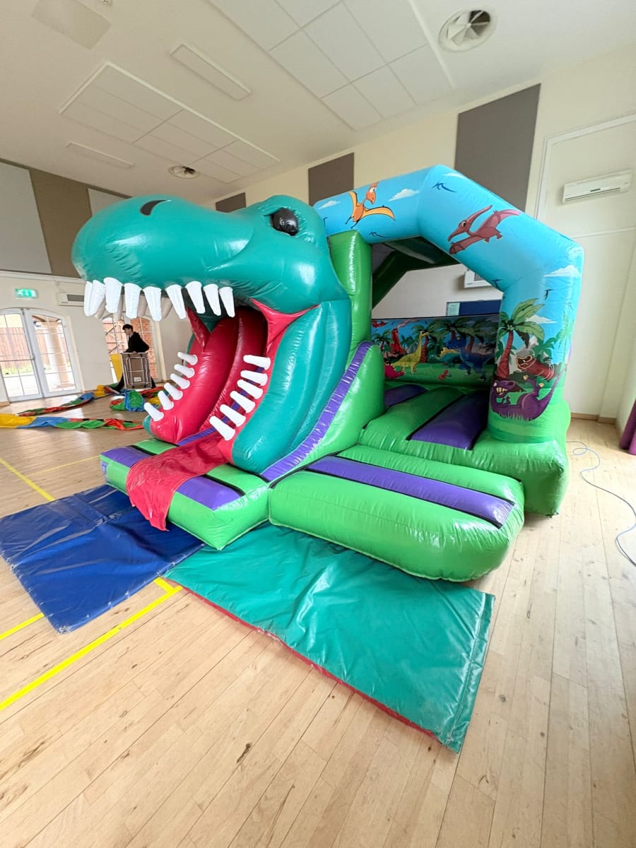 Make your party roar to life with our 12x15ft Dinosaur 3d bouncy castle with slide. 🦖 This vibrant green and purple inflatable combines a roomy bounce area with a fun slide. Perfect for birthdays, school events, and community fêtes. Bouncy castle hire 12x15ft Dinosaur 3d bouncy castle with slide in Wythall, Solihull, Bromsgrove, Redditch, Birmingham, Balsall Common, Warwick, Henley in Arden