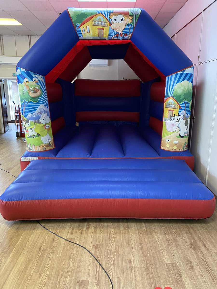 farmyard Bouncy castle available for hire, this castle is 11x15 ft in dimension and requires extra space around the inflatable for pegging, mats and blower. A popular theme for 2022 and a great new theme for our party packages