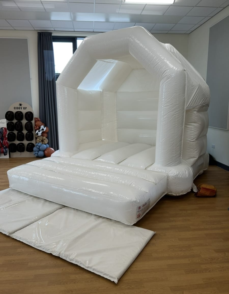 White bouncy castle hire White 12x12ft bouncy castle in Solihull, Bromsgrove, Warwick, Redditch, Studley, Wythall, Balsall common, Henley in arden. This elegant 12x12ft bouncy castle delivers a neutral, stylish play space for weddings, christenings, corporate events, and upscale parties. It’s bright, safe, and photo-ready. Perfect when you want a refined look without sacrificing fun. ✨