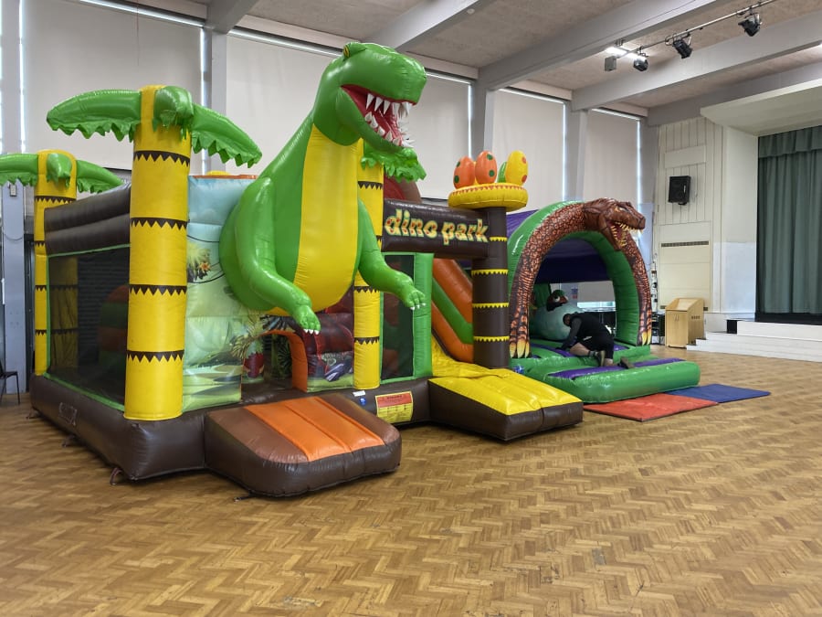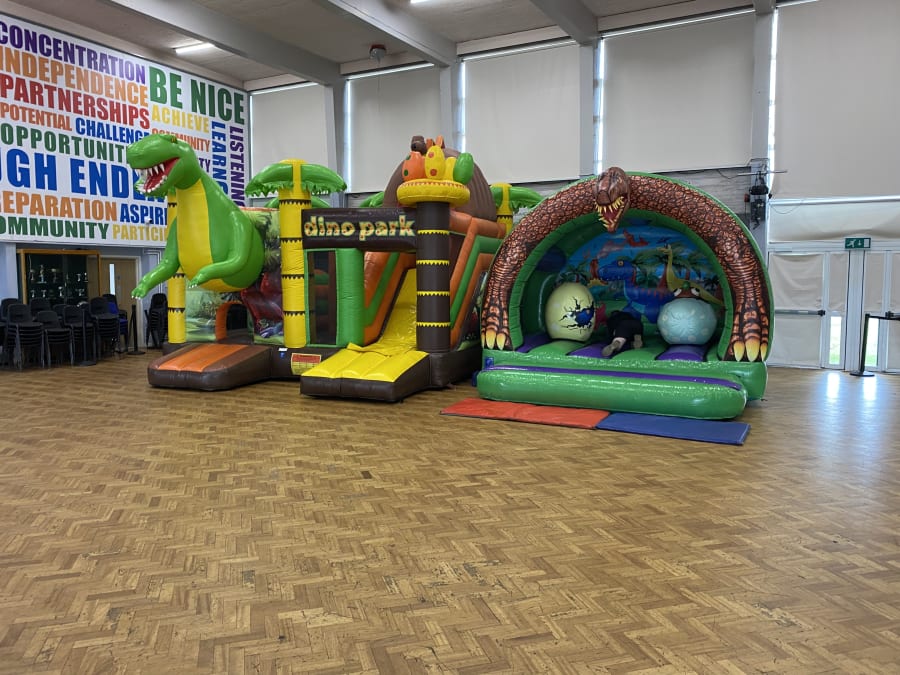 If you are looking for dinosaur bouncy castle hire in Solihull, Bromsgrove and surrounding areas, look no further! This package includes our showstopper of a dinosaur playpark which has obstacles, a big slide , bouncy area and a gigantic t-rex all in one unit and a separate 12x12 3D bouncy castle with a raptors head and dino egg obstacles! The venue shown is woodrush hall in wythall, we can advise on which venues will fit this package or we hire outdoors march- October
